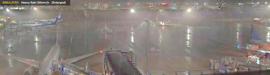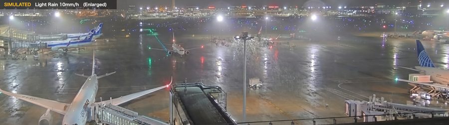 降雨(50mm/h)により視界が悪化した夜間の誘導路の状態を再現