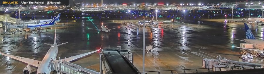 雨上がりの濡れた強い反射のある夜間の誘導路の状態を再現